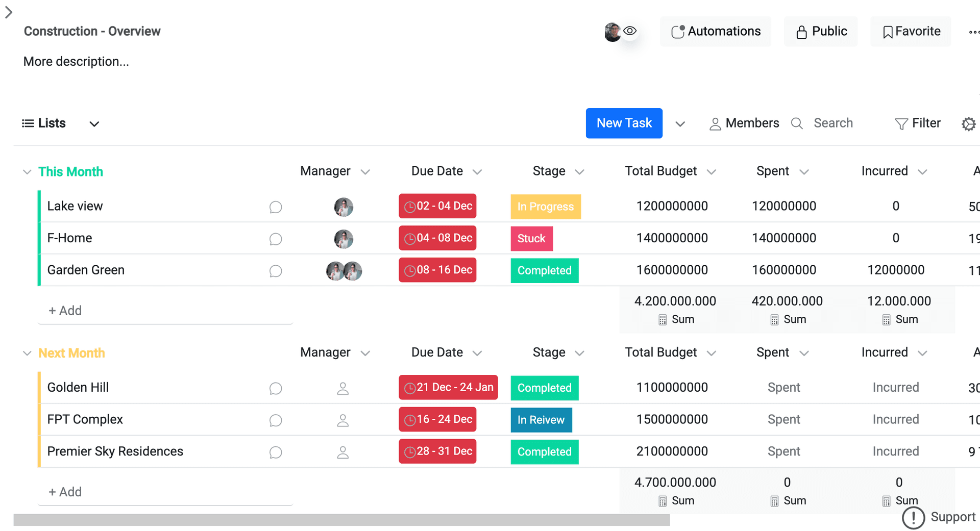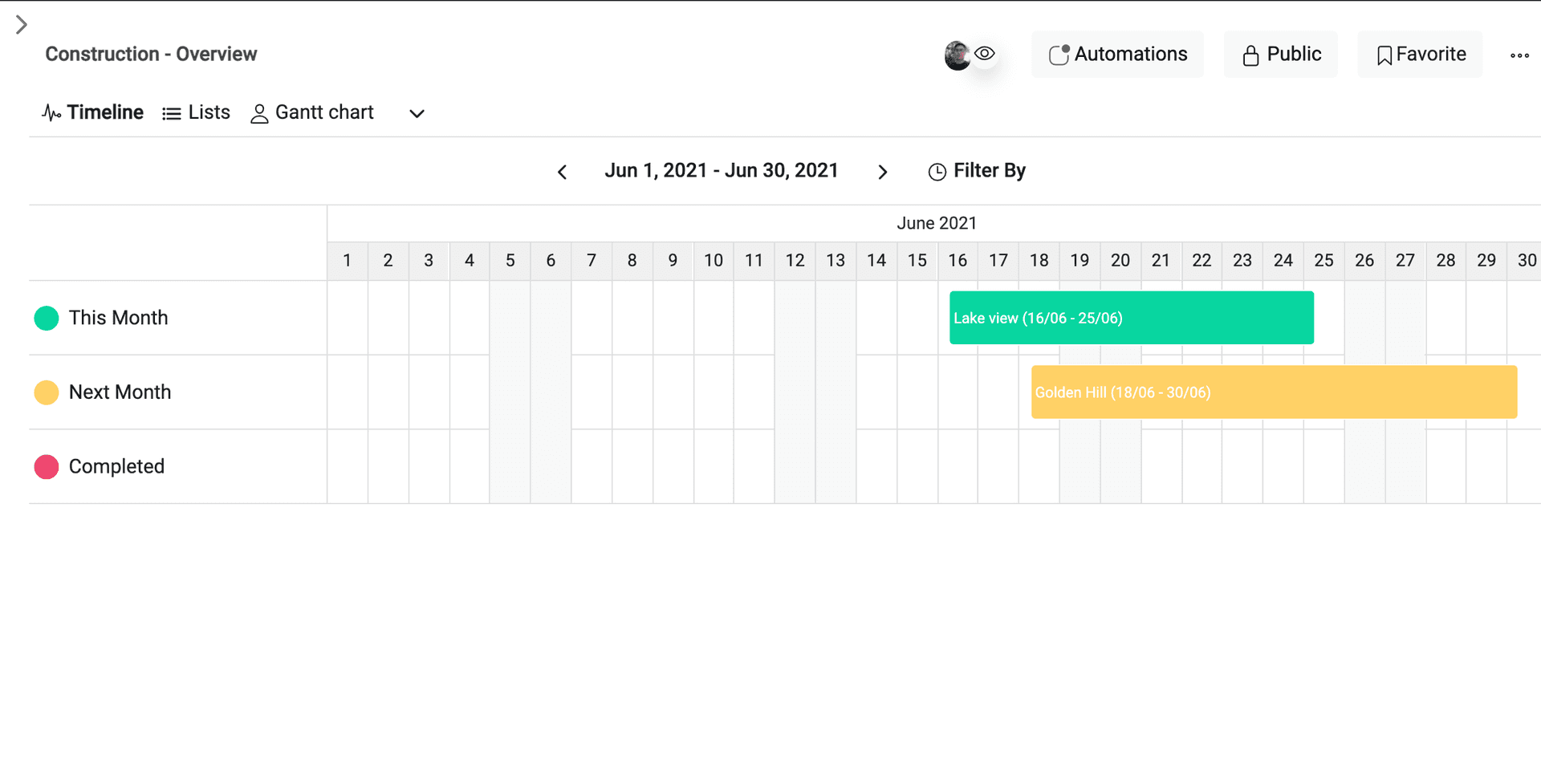 Manage the progress of your construction projects in a visual way. Track the different stages, deadlines, and know where things stand at all times.